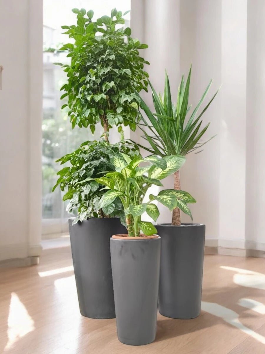 | Name | Green Goodness Pack | Radermachera 2 Step, Yucca, Dieffenbachia Plant | Black Long Ceramic Pot Set |