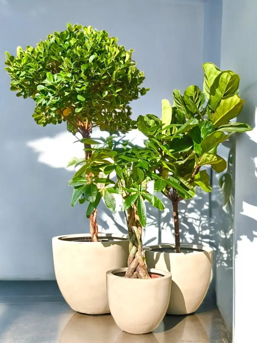- Light: Place in bright, indirect sunlight. The Ficus Lyrata and Ficus Panda thrive in well-lit spaces, while the Pachira can adapt to moderate light.